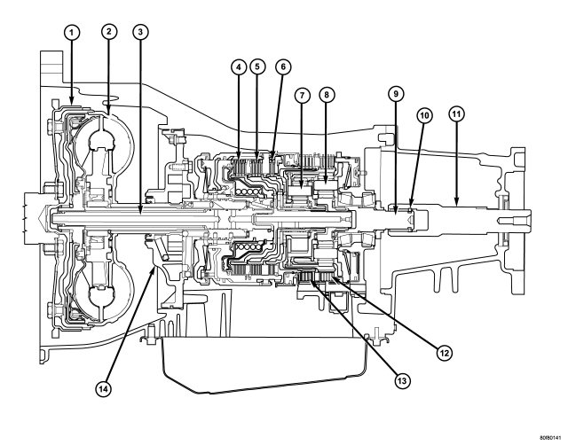The 42RLE is a four-speed transmission that is a conventional hydraulic/mechanical assembly controlled with adaptive electronic controls and monitors. The hydraulic system of the transmission consists of the transmission fluid, fluid passages, hydraulic valves, and various line pressure control components. An input clutch assembly which houses the underdrive, overdrive, and reverse clutches is used. It also utilizes separate holding clutches: 2nd/4th gear and Low/Reverse. The primary mechanical components of the transmission consist of the following: