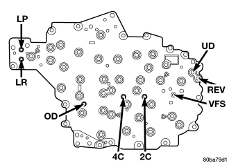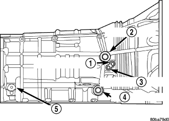 Only two pressure ports are supplied on the transmission case. The torque converter clutch apply (3) and release (1) ports are located on the right side of the transmission case.