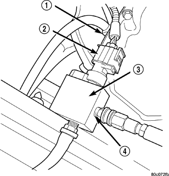 To determine the line pressure, there are two available methods. The scan tool can be used to read line pressure from the line pressure sensor. The second method is to install Line Pressure Adapter 8259 (3) into the transmission case and then install the pressure gauge and the original sensor (2) into the adapter. This will allow a comparison of the scan tool readings and the gauge reading to determine the accuracy of the line pressure sensor. The scan tool line pressure reading should match the gauge reading within ±10 psi.