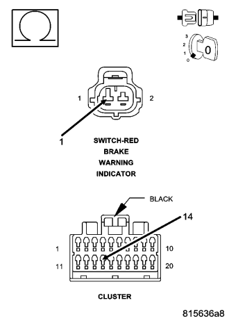 The cluster performs open circuit detection on the Brake Fluid Level (Red Brake Warning Indicator Driver) switch and the sense circuit. Fault sets if an open circuit is detected. When this fault is detected the cluster will illuminate the Brake warning indicator.
