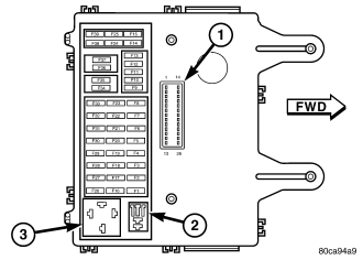 NOTE: The DRL relay is installed in the Junction Block (JB) on the driver side outboard end of the instrument panel. Vehicles equipped with this relay MUST NOT have a headlamp high beam relay installed in the JB. Also, although the terminals of the DRL relay are laid out in a footprint that is similar to that of a conventional International Standards Organization (ISO) relay, a standard ISO relay MUST NEVER be installed in the place of the DRL relay.