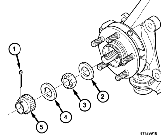 The left halfshaft inner tripod joint and the intermediate shaft are both splined into the transaxle side gears. The inner tripod joints are retained using a snap ring located in the stub shaft of the tripod joint. The outer CV joint has a stub shaft that is splined into the wheel hub and retained by a hub nut (3) and washer (2), nut lock (5), spring washer (4) and cotter pin (1).