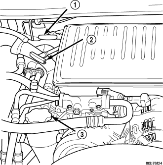 The engine oil level indicator (2) is located at the right rear of the engine on the 3.7L engines. .