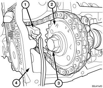CAUTION: Remove excess oil from camshaft sprocket retaining bolt before reinstalling bolt. Failure to do so may cause over-torqueing of bolt resulting in bolt failure.