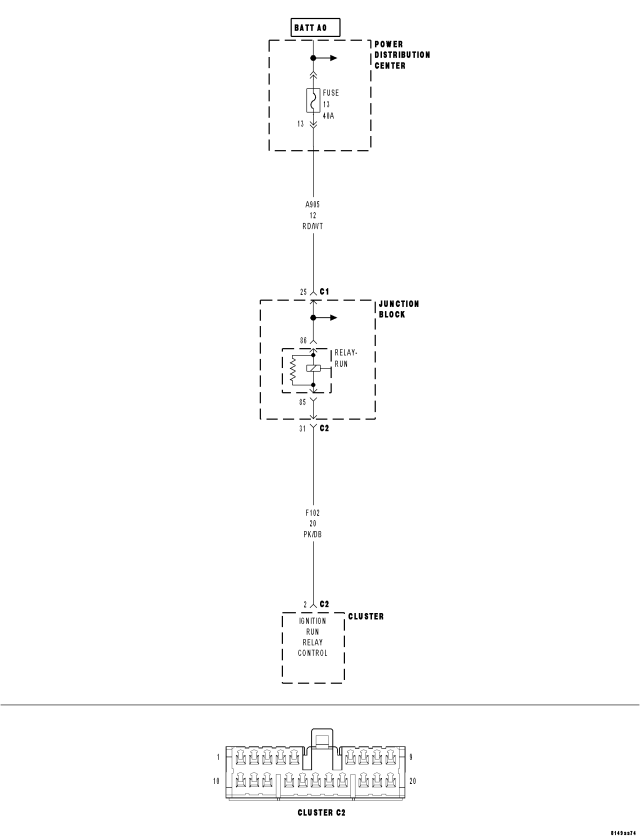 When the Cluster senses a high condition on the (F102) Ignition Run Relay Control circuit for over 10 seconds, this code will set.