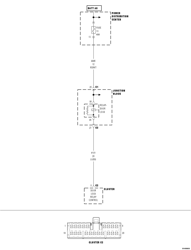 When the Cluster senses a low condition on the (P777) Door Lock Relay Control circuit for over 10 seconds, this code will set.